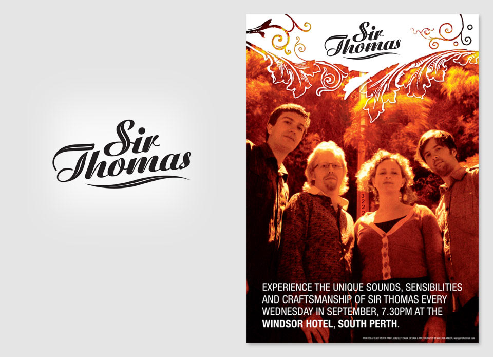 Sir Thomas sought a logo that reflected their musical style. Followed by a design for their ep CD and gig poster, creating a sense of who they are personally and professionally.